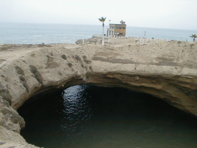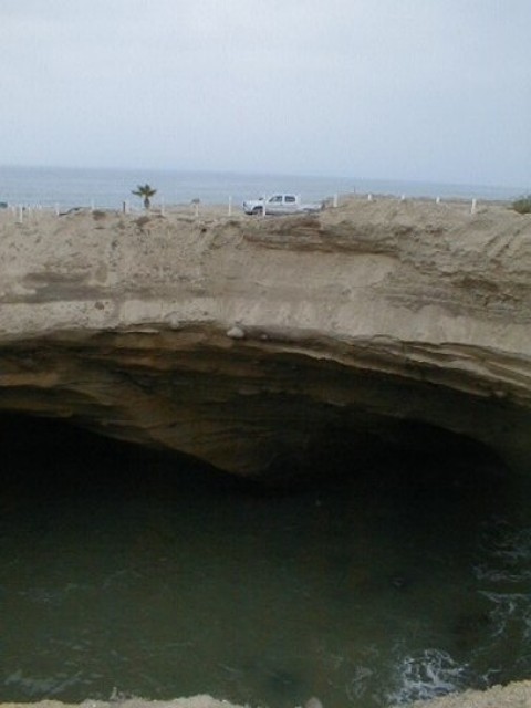 6 miles north of El Rosario, a dirt road goes west 1/2 mile, then south 2 1/2 more miles to this giant open roof sea cave/ crater where sea lions (lobos) can be seen far below on their own private beach.