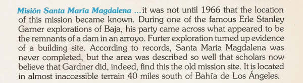 What they found nearly 40 miles from Bahia de los Angeles was so impressive that desert expert and author Choral Pepper believes it may have been the beginings of a Spanish mission shown on a 1757 Jesuit map, but otherwise not recorded in known writings. A bell with ill-fated mission’s name, ‘Santa Maria Magdalena’, ended up at the nearest established mission, Santa Gertrudis.