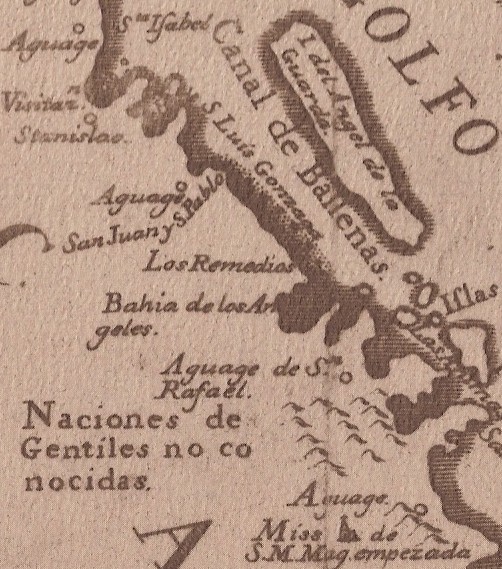 At the bottom notice ‘Miss de S.M.Mag. empezada’, (empezada means ‘started’). While shown south of the location of the ‘Pepper’ ruins, it is still illustrated as the next mission north of Santa Gertrudis (then called ‘Dolores del Norte’). The map map was drawn from other’s information between 1746-1749, as the author/ cartographer never was in California.