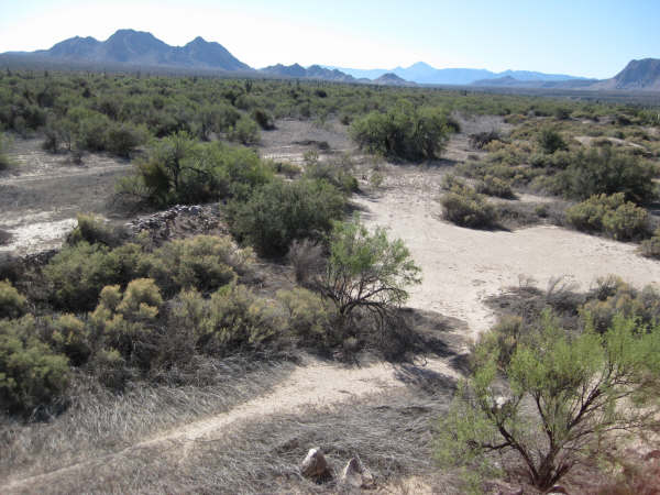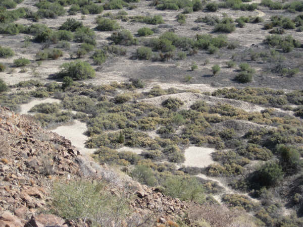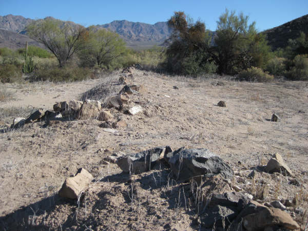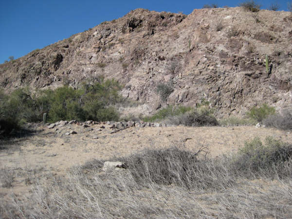 This wall runs across the desert floor, north of the mesa. It disappears into the brush and trees.