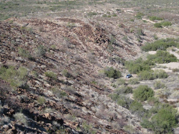 The wall… the one seen from space… from the road to Bahia las Animas. Surely others have seen this and investigated? We drove all the way around and parked at the closest approach. A very steep climb was required, but worth it…