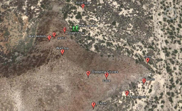 The many man-made finds are marked. The wall (#1) is easily seen from above.