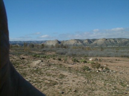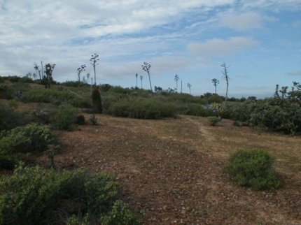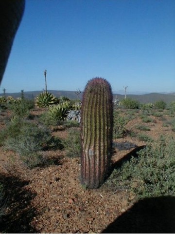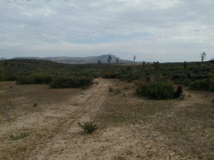 In this southeast facing photo, Mesa la Sepultura is seen. The Camino passes to the north of the mesa going to San Fernando Velicatá. To find this piece of El Camino Real, take Mexico Highway 1 to Km. 80+ (almost K-81) about 14 miles from El Rosario. There is a sharp curve to the left and here a wide dirt road turns off to the right (south). This is the road to Punta San Carlos (36 mi.). Go just 0.5 mi. and turn right on the dirt road going west. Go 1.4 miles on this road and park. You are on top of the ECR route. The Camino Real hike begins at 30°1.17′, -115°33.31′ (map datum WGS84) elev. 973′. The old trail goes straight towards El Rosario (northwest). I hiked about a mile of it in November, 2004. For more on El Camino Real and maps of it’s route, see http://vivabaja.com/ECR