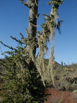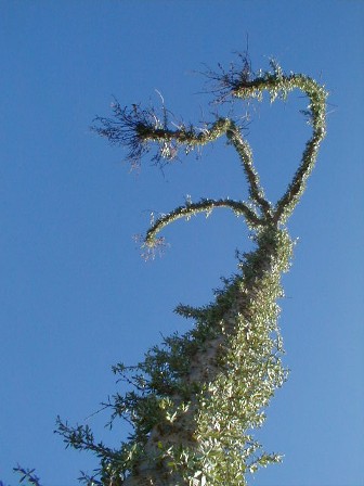 Spanish moss hangs from some boojums along the road, east of Cuesta la Vibora: 30°08.99′, -115°31.57′