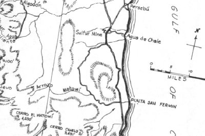 The area of our day trips as it appeared in this 1962 map by Howard Gulick. Note: ‘Persebu’, ‘Agua de Chale’, Sulfur Mine, and Arroyo Matomí.