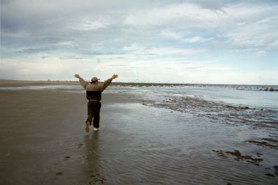 Surfer Jim on the (mostly gone) causeway road to Shell Island. Built to provide high tide access in 1984 for a development that never was started. The concrete culvert/ bridge remains while most of the elevated road bed has eroded away. (Bob H)