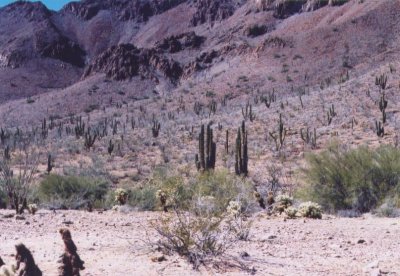 Rugged land with chollas and cardóns at the edge of Matomí canyon. (Tunaeater)