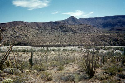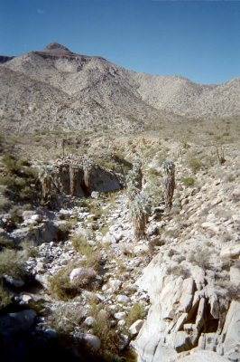 The south edge of Valle Chico is the Matomí canyon. An old road grade is seen on the opposite bank. Here the Valle Chico road drops steeply down to the big arroyo. (David K)