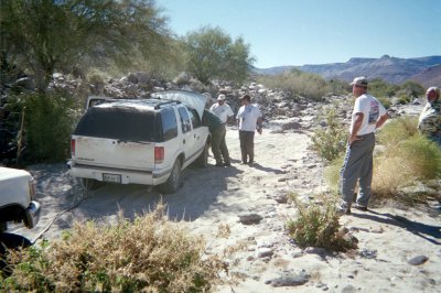 Three vehicle from Mexico’s Fish & Game/EPA department were in Matomí to check on big horn sheep and other rare animals. The Chevy is stuck because a vacuum hose was bad and the 4 wheel drive didn’t work. (David K)