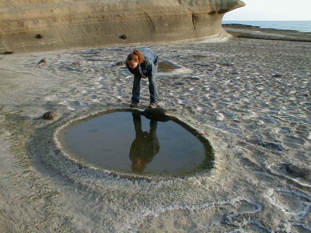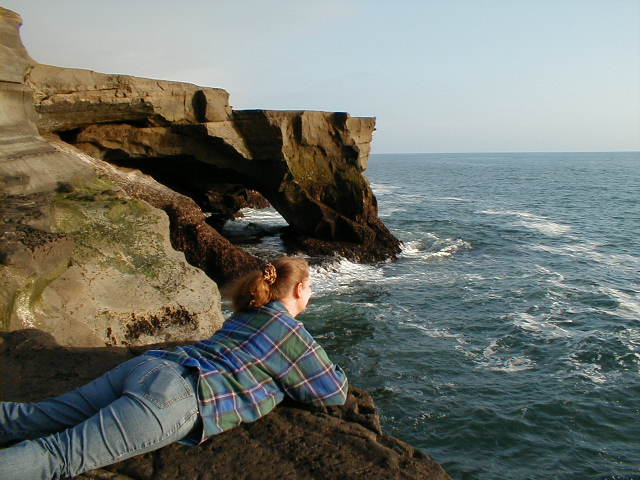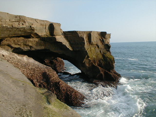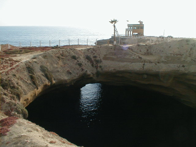 Actually a huge sea cave with a sky light! The unmarked good road leaves Hwy. 1 at Km. 47.5 (6 miles north of El Rosario’s Pemex station), and goes 3 miles to the parking area next to the rope-fence surrounded ‘crater’. Ignore the private property/ keep out (in Spanish) signs, half way in.