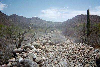 Along the highway into Bahia de los Angeles, the original trail connecting the California missions can be seen just south of the Km.30 post. 29°1.82′, -113°52.13′ (WGS84).