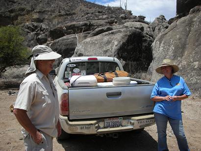 Roy and Elizabeth getting ready to hike up the Las Pintas trail. Roy traveled with us for the first part of our week in his Land Rover.