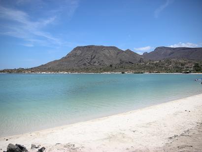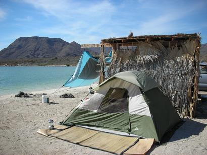 South of Mulegé is Bahia Concepción with many camping places. El Requesón has palapas on a sand beach which connects to an island at low tide,