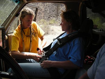 Leslie helps Elizabeth gets secured for a fun run in Gadget’s Bronco! Gadget (Wil) helps pit off road racers as part of Team Locos Mocos.