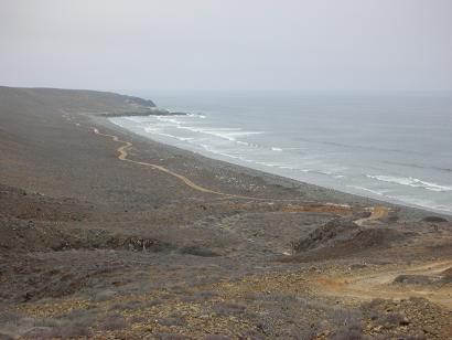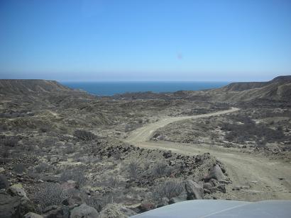 21.1 (1.9) Fork, left to Punta Canoas and right for Santa Catarina Landing… we go right. The road climbs to the the top of a ridge and then drops down to the coastal plain. The original road used to haul onyx over can be seen to the north.