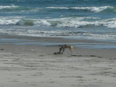 On the beach, south of El Cardón and Punta Lobos we look for a camping spot in the dunes. This coyote is having some seafood for dinner.
