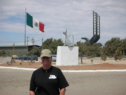 Tuesday morning we finish our drive down the distant Pacific dirt road, have tamales for lunch at Carmelita’s in Villa Jesus Maria, and reach the state border near Guerrero Negro where a giant eagle monument was built on the border celebrating the completion of Highway One, in 1973.