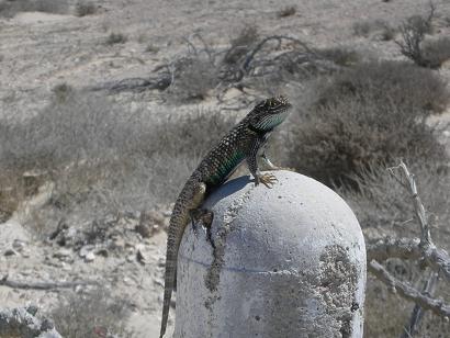 Between San Hipolito and La Bocana a lizard uses this kilometer marker for a look-out tower.