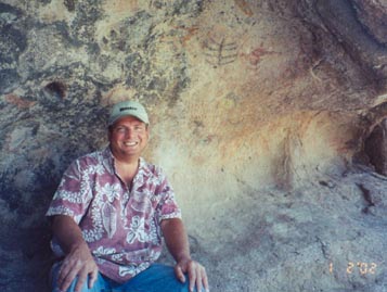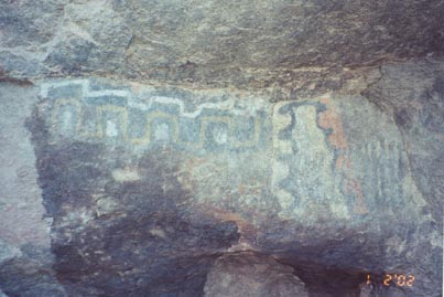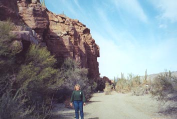 Here is Mindy at the cliff containing many paintings. The site is accessed off the San Borja road, 2 miles south from the L.A. Bay highway, and 5.8 miles east, through a boojum forest. * ‘Living Mountain’ (also spelled Montevideo)
