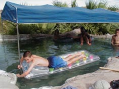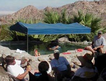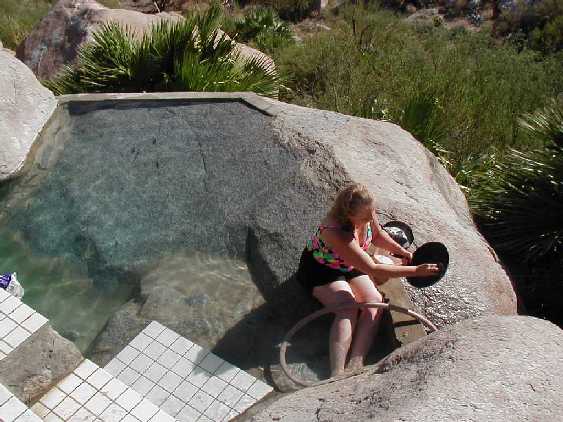Sarah K in El Mirador’s hot tub, perched on the edge of the palm canyon.