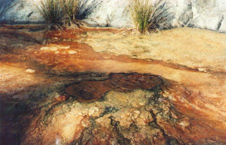 About 5 of these tiny springs can be seen on this hillside. The geyser and ‘onyx dome’ eluded us on this trip. (7-24-00)