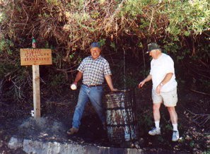 Just a couple miles before entering the park, this year round water source is located at the tiny campground of Los Manzanos. ‘El Choco’ assists Andrew (right) with mucho enthusiasm.