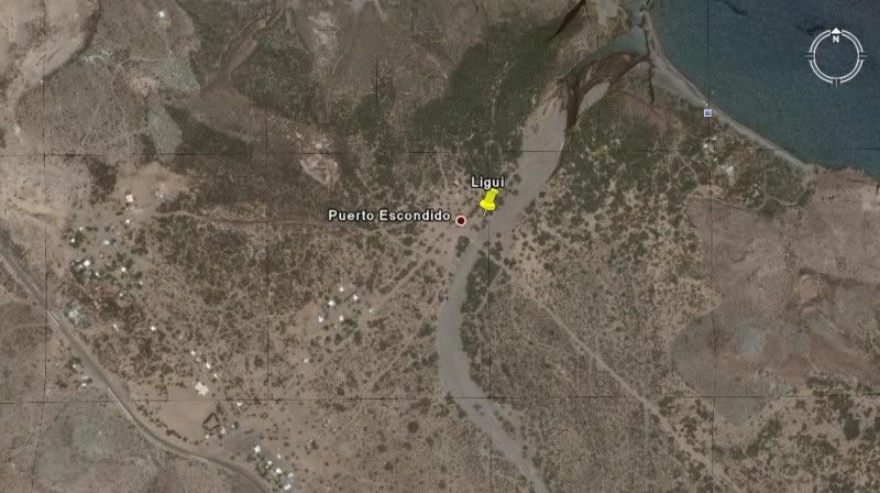 SAN JUAN BAUTISTA DE LIGÜÍ/ DE MALIBAT 25°44’22.20″ -111°15’51.00″ (no remains, arroyo swallowed ruins in 2001) At the southeast junction of the road to Playa Ligüí and Ensenada Blanca, just east of Hwy. 1, nine miles south of Puerto Escondido.