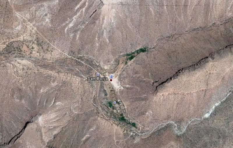 SAN BORJA 28°44’40.37″ -113°45’14.39″ Well signed 21 miles south of L.A. Bay highway or east of Hwy. 1 at Nuevo Rosarito.