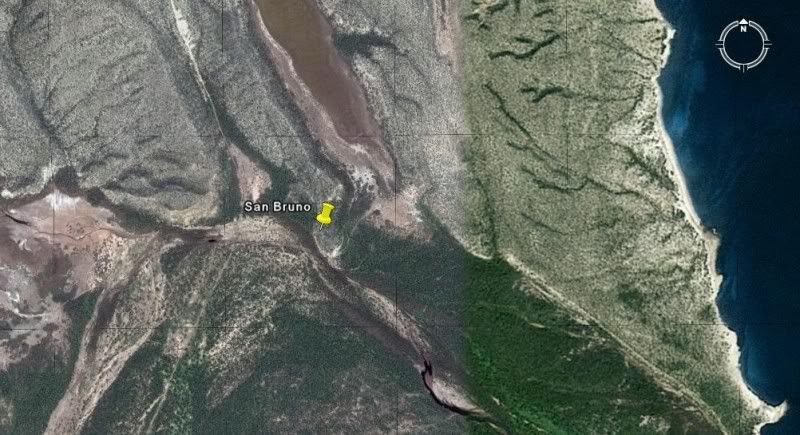 SAN BRUNO (1683-1685 colony site) 26°13’57.50″ -111°23’53.90″ 14 miles north of Loreto near, the coast on a hill.