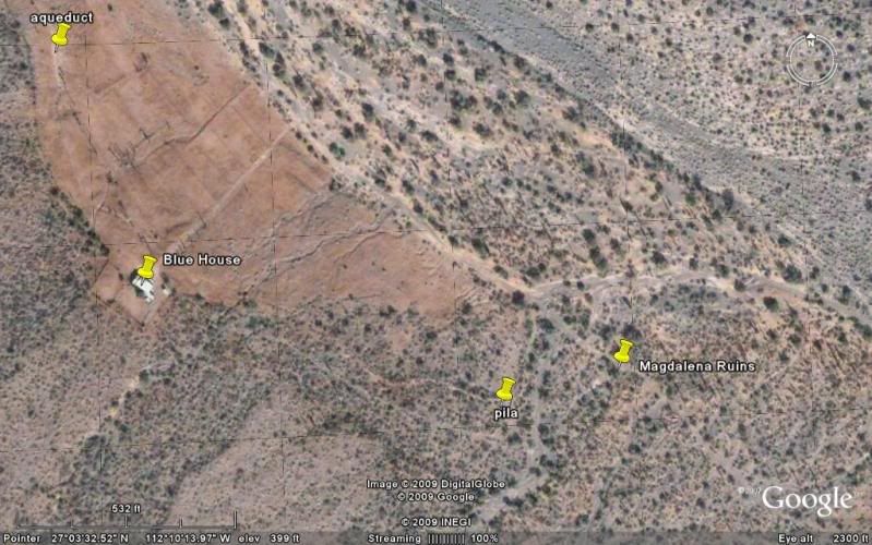 (Pila/ ag site for San Jose de Magdalena, mis-identified as Misión Santa Maria Magdalena) 27°03’29.10″ -112°10’12.34″ Located just outside the canyon ‘Boca de Magdalena’ east of Palo Verde, north of Mulegé. The stone building ruins are on both sides of the road at 27°03’29.90″ -112°10’07.40″, 4.6 miles from Hwy. 1 at Km.162.5 (take left road at mile 3.7). Ruins destroyed by flash flood in 2014. Pila is partially destroyed.