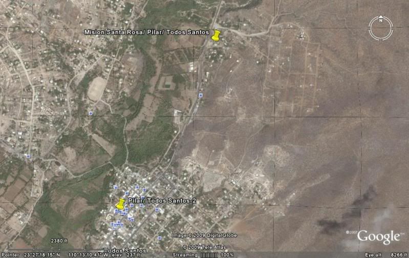 TODOS SANTOS: There are two missions and two mission sites at Todos Santos. The first site began as a visita for the La Paz mission (named ‘Todos Santos’), then became a separate mission named ‘Santa Rosa de las Palmas’… some stone foundations are all that remain across from a modern church is built on the site: 23°27’37.30″ -110°13’08.31″]. The La Paz mission (Nuestra Señora del Pilar de la Paz) moved from the Bay of La Paz to Todos Santos and that ended the Santa Rosa mission… The second site is the location of the modern town church of Todos Santos, where the mission moved. 23°26’59.16″ -110°13’31.62″