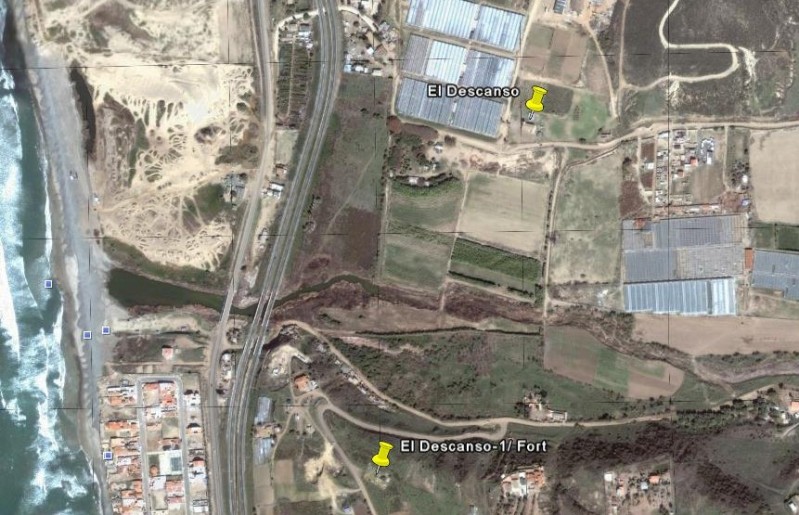 EL DESCANSO 32°12’19.62″ -116°54’19.24″ Located behind a church that can be seen from the Ensenada toll road. An exit just north once was signed for the mission, but has been renamed ‘Rancho Descanso’. Access from the free road along the lagoon/ arroyo, under the toll road bridge (south of the Cantamar sand dunes). The original site (1810-1830) and fort location (Descanso-1/Fort) is to the south of the arroyo, on the hill: 32°11’59.40″, -116°54’30.00″