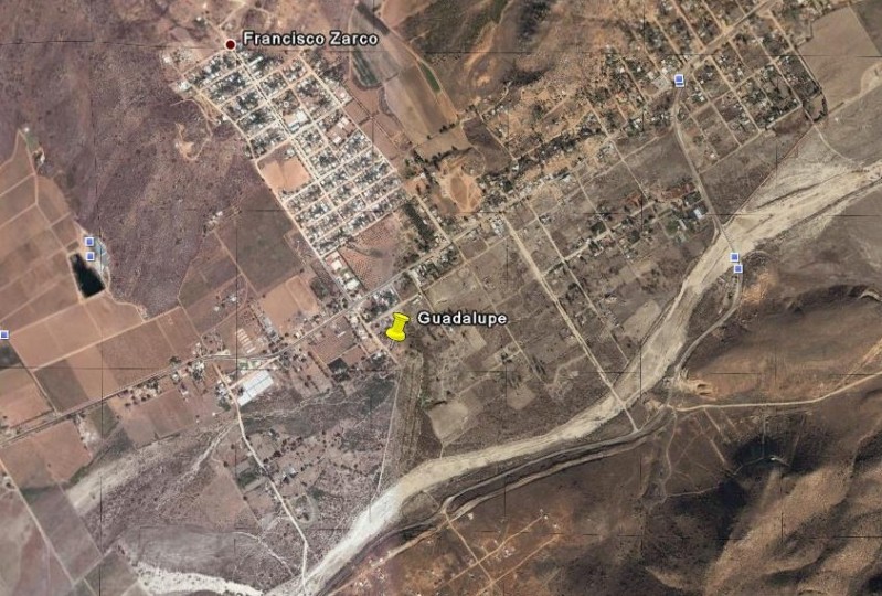 GUADALUPE 32°05’31.0″, -116°34’27.3″ Located on a dirt street 1/4 mi. east of the entrance paved road going through Guadalupe, 0.8 mi. from Highway 3.
