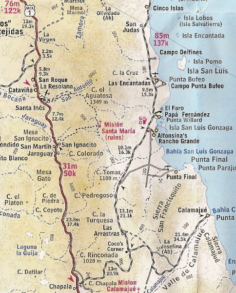 Mission Santa María is 300 highway miles south from San Diego and 14.4 miles off the main road on a 4WD trail, between Cataviña and Bahia San Luis Gonzaga.