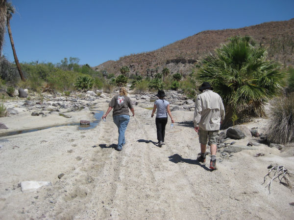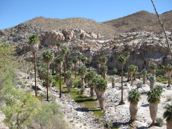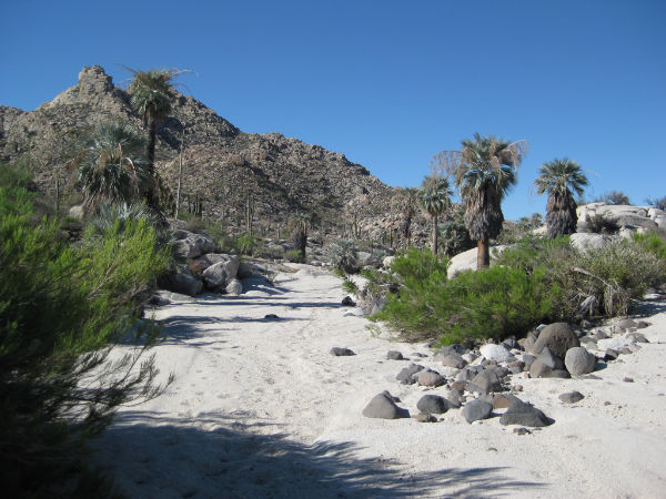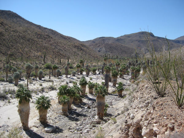 The road drops into the arroyo and follows it for a half mile ending in the palms. A hidden side road goes left, out of the arroyo before the palms. Road building ended on the ridge seen in the distance, overlooking the deep canyon beyond.