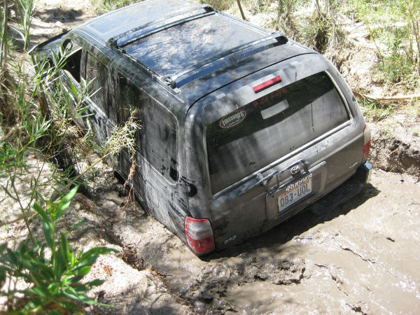 The 4Runner (lacking the rear locker) couldn’t drive through the 3 foot deep water and mud, so Paul turned around and went back in to pull Steve out.