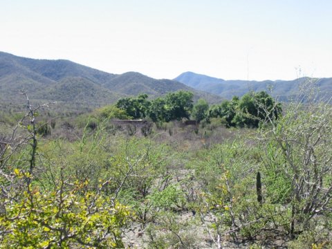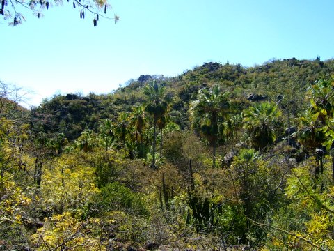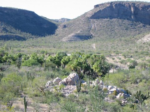 Beyond San Blas, a trail is reported to go to ‘Angel de la Guarda’ a visiting station of the La Paz mission. The ‘visita’ is also known as El Zalate and was established in 1721 at a pretty oasis near the top of the Trinchera range. A tiny spring feeds fruit trees and a palm grove (per Gulick in 1956).