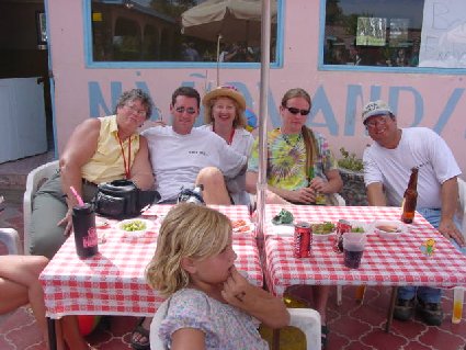 The Viva Baja Van and P.O.T. (Poor Old Truck) gang at Rancho Santa Ynez, for lunch. Seated: Sarah, Miguelito, Chris, Mary Ann, Travelpearl, Desert Rat. Standing: David Eidell, El Camote, Mike Humfreville. July 2, 2001