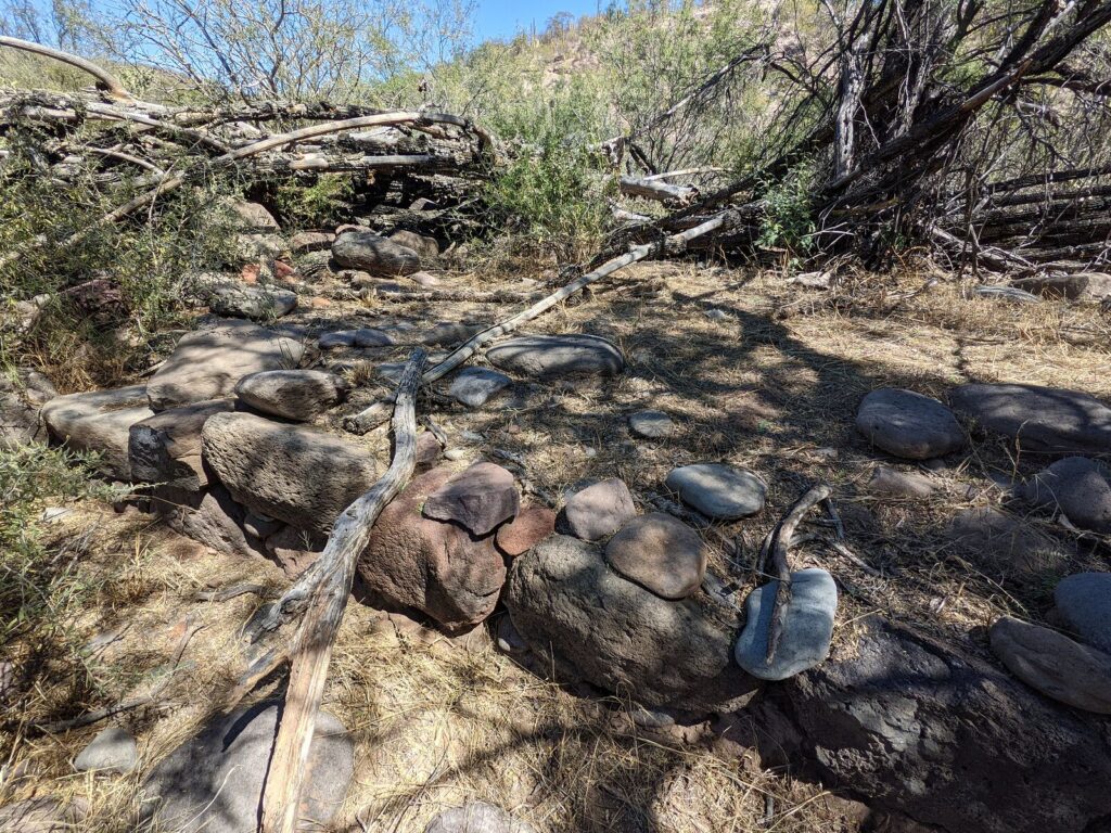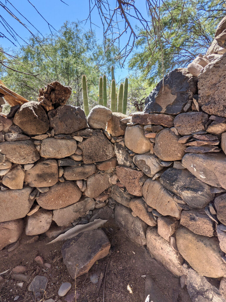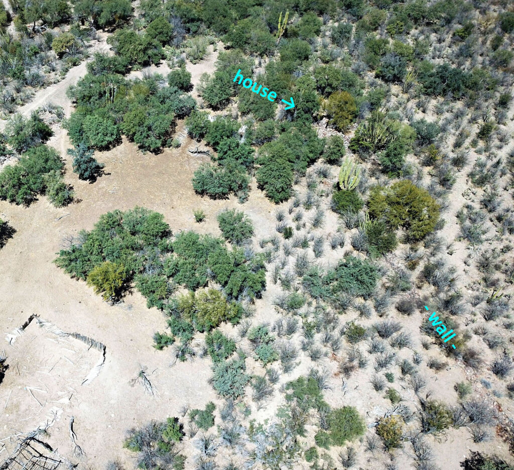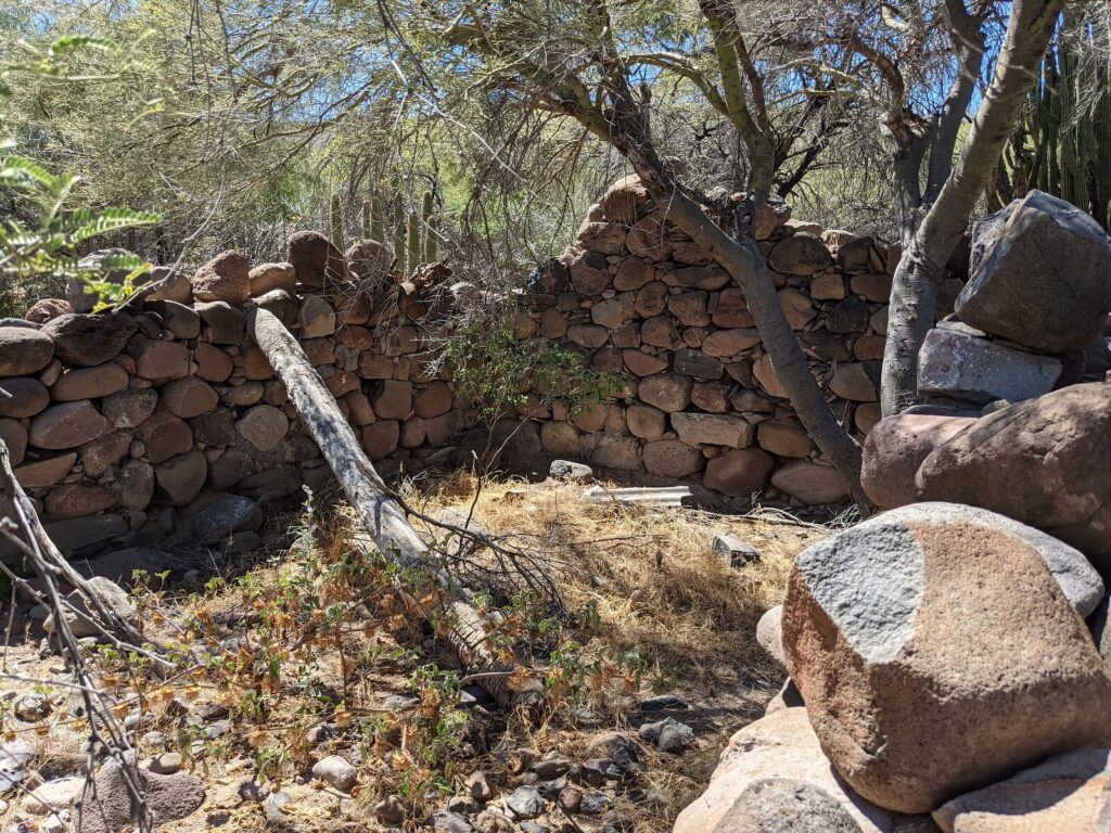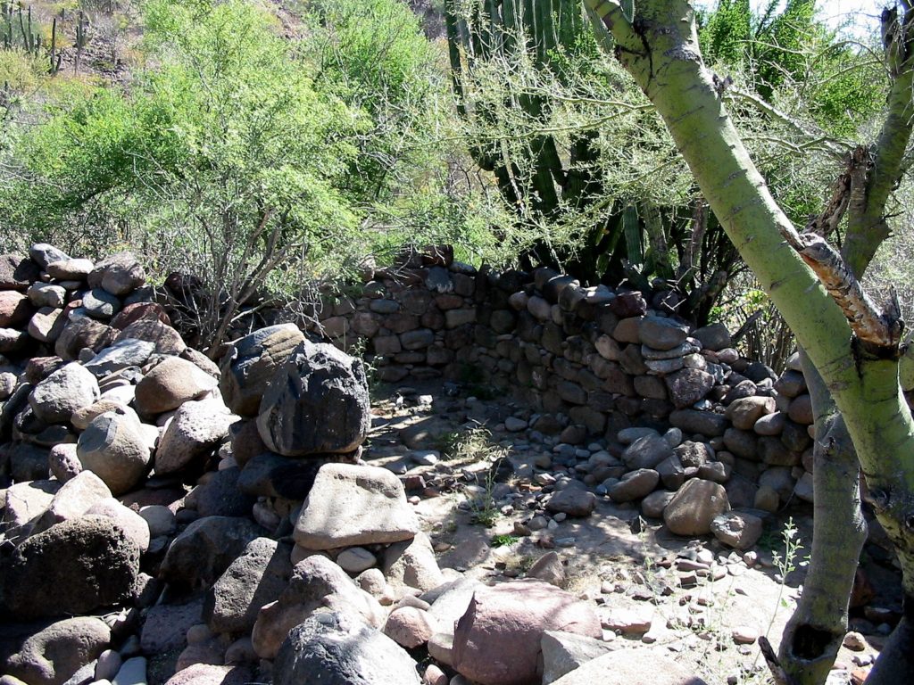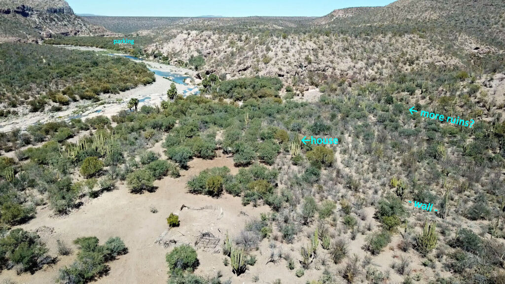 The priest’s house ruins are at N26°16.45’, W111°43.14’ and other walls are just northeast. The mission church was made of adobe and nothing remains of it. It was next to the padre’s house, forming the long line of a letter L (with the house being the small line). See the plan below from Harry Crosby’s book, Antigua California.