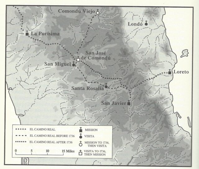 The fifth California mission was founded by the Jesuit Padre Julián de Mayorga about thirty miles northwest of Loreto, on a stream that flowed west to the Pacific Ocean. The new mission name was a combination of the Indian name for the site (Comondú) and the Spanish name, “San José de la Giganta,” given to it by Padre Juan María de Salvatierra, Loreto’s founder. The Marqués de Villapuente, José de la Peña Castejón y Salcines was the mission’s benefactor.