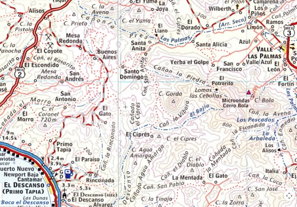 We find a way around by using a small canyon of CAÑADA EL CIPRES to the north and west of EL DORADO. A small rancho is passed at 32°21.85′, -116°48.02′, elev. 837′, possibly SANTO DOMINGO on the map.