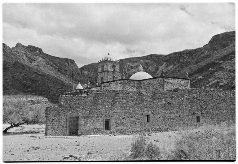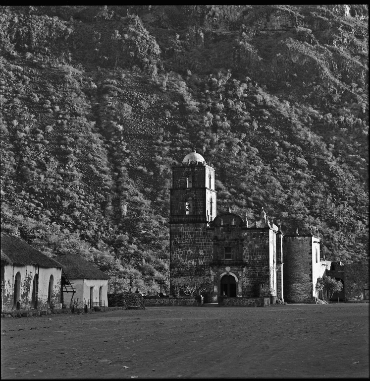 This photo appears in the preface of the book Baja California Land of Missions, page xii. The author (David Kier) is dwarfed by the massive, hand-built church.