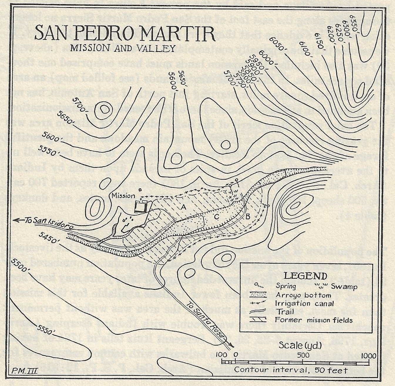 the most suitable. One was northeast of San Vicente near a pass (El Portezuelo) leading to the Colorado River. The other potential mission site was east of Mission Santo Domingo in a high mountain meadow. In a letter dated January 15, 1794, Arrillaga stated that Mission San Pedro Mártir would be founded east of Santo Domingo that April.