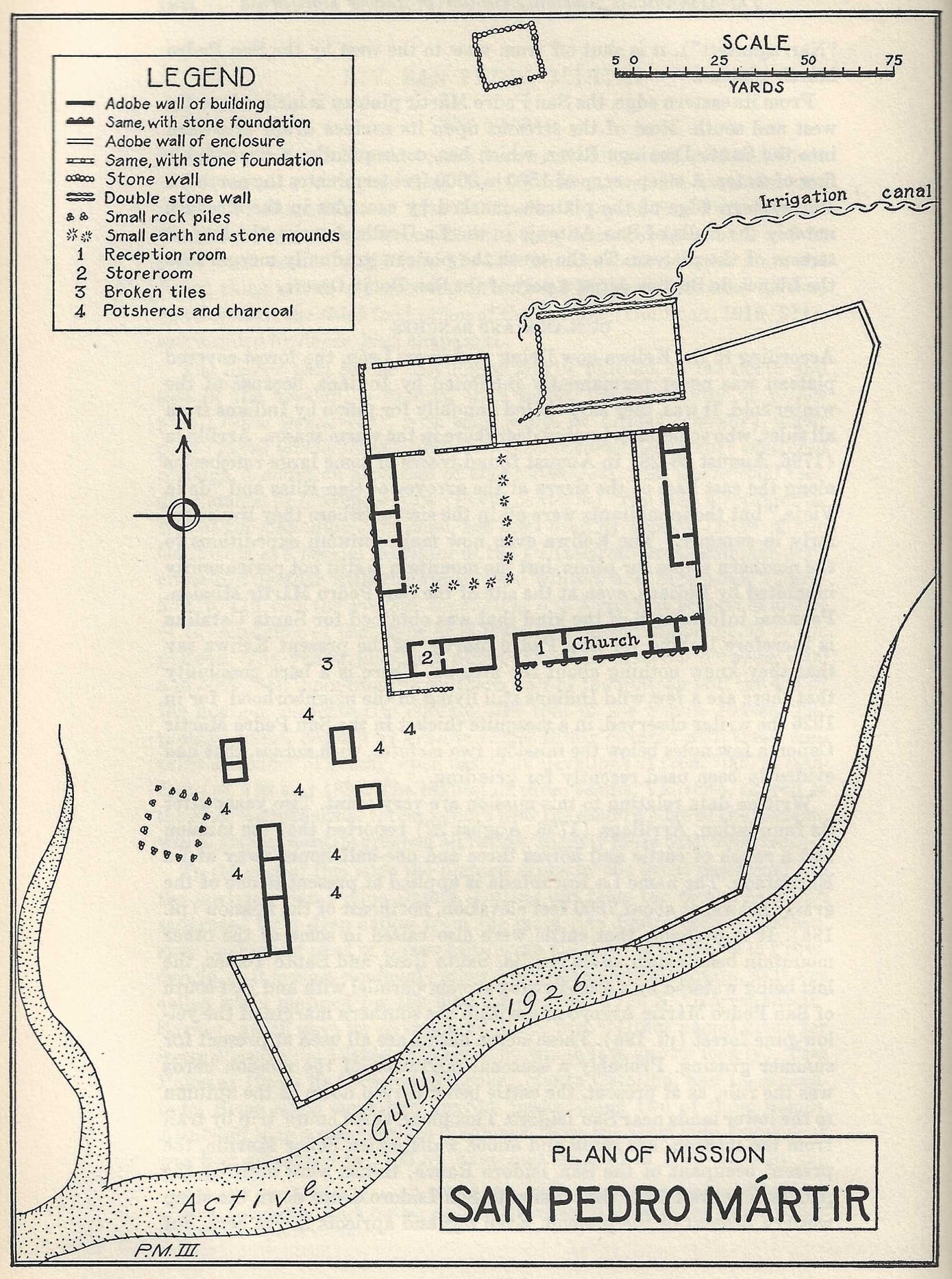 The mission was in a region where the Kiliwa Indians only visited seasonally. A large workforce was not easy to assemble without there being a permanent local population. The complex at Ajantequedo was large and mapped out by Peveril Meigs during his field work on the Dominican missions in 1926. It resembled a fort with defensive walls for protection. Water for mission crops came from springs on opposite sides of the valley and above the stream. Irrigation canals were built from the two springs, and both ran for a half mile to the fields and to the mission. In 1926, Meigs found the mission floors were partly tiled with red nine inch square bricks, and pieces of red roof tiles were abundant. Meigs stated that San Pedro Mártir was a “highly developed, picturesque, and unique mission.” The elevation at the second site is 5,060 feet above sea level, making it the highest Spanish California mission.