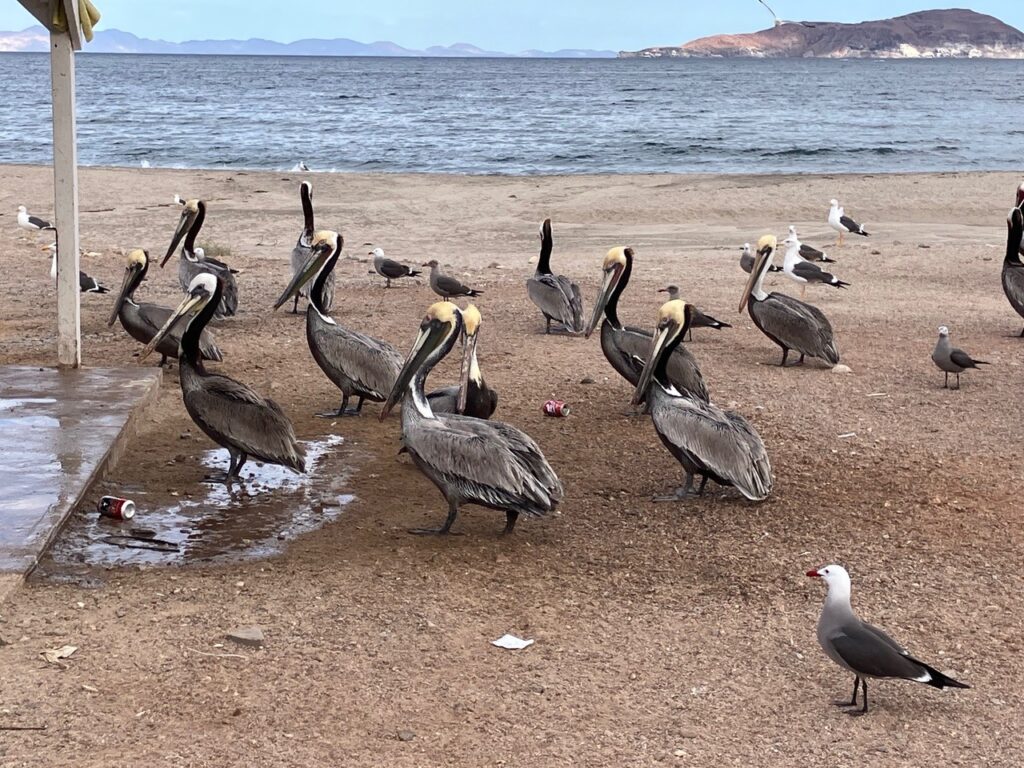 Hummingbird at feeder, Playa Coyote, with honey bee underneath (4-24)Some kind of thrasher (4-24)Dead gopher snake (4-24)Desert cat (4-24)Scary looking crab with death mask pattern (4-24)Dog with cone, relaxing (4-24)Pelicans facing off (4-24)